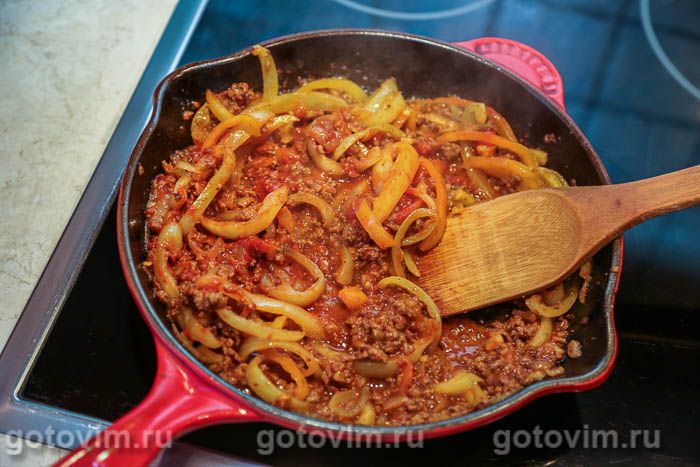 Добавить помидоры и перец в мясной фарш, вернуть сковороду на плиту и готовить все вместе, помешивая, пару минут.