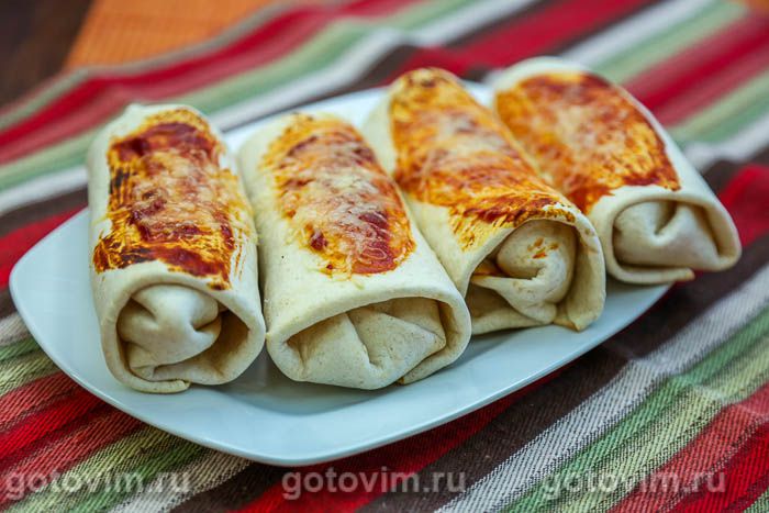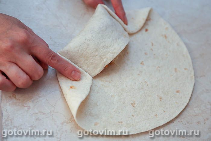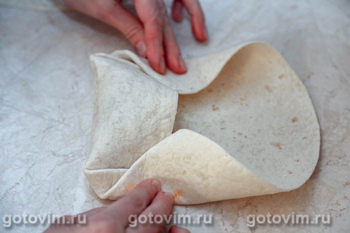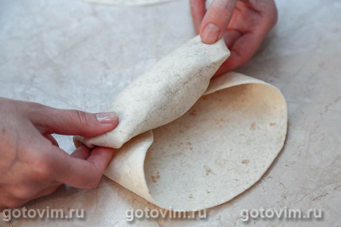 Свернуть лепешки в трубочку, подгибая края, чтобы не вывалилась начинка.