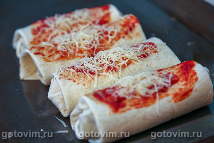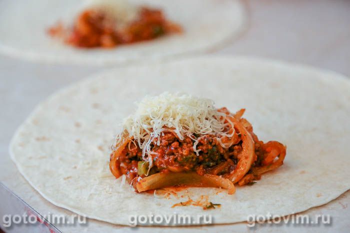 Положить буррито швом вниз на противень, смазать кетчупом и посыпать сыром. Поставить на несколько секунд под гриль, чтобы сыр расплавился. Готовые буррито с мясным фаршем и сладким перцем переложить на тарелку и сразу же подавать к столу.