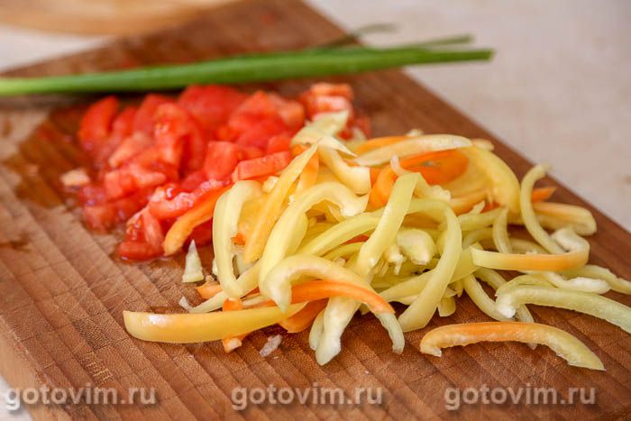 Помидоры порезать небольшими кубиками. Сладкий перец разрезать пополам, удалить семена, нарезать полосками.