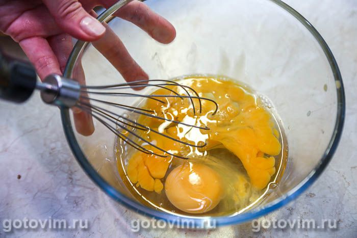 Когда основа фриттаты из жареных колбасок и овощей будет готова, можно заняться яичной заливкой. В миске взбить венчиком яйца с молоком (или сливками), солью и молотым перцем. Добавить измельченный на мелкой терке сыр и еще немного взбить. По желанию можно добавить мелко нарезанную зелень, все перемешать.