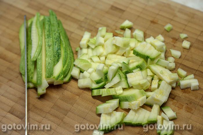 Молодой тонкошкурый кабачок (или цукини) вымыть под проточной водой, обтереть досуха бумажными полотенцами и нарезать маленькими кубиками.