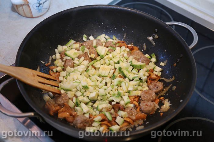И, наконец, добавить в сковороду кабачки. Посолить, поперчить и обжаривать все вместе до готовности кабачка.