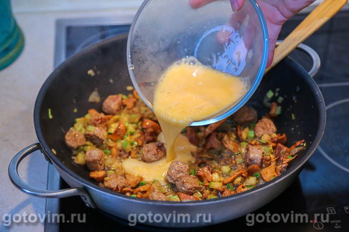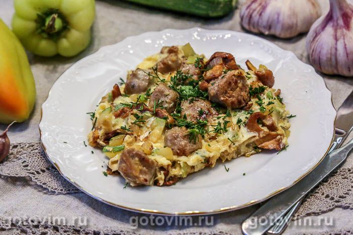 Готовую фриттату с колбасками, лисичками и кабачками Нарезать на порции и подавать на стол горячей. Приятного аппетита!