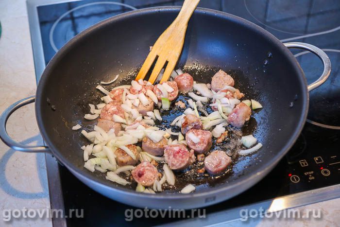 На раскаленной сковороде прогреть растительное масло, добавить нарезанные колбаски и быстро обжарить со всех сторон до аппетитной корочки. Посыпать луком и обжаривать, помешивая, до прозрачности лука.