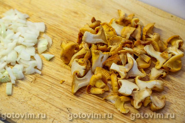 Свежие грибы (у меня были лисички) промыть, обсушить на бумажных полотенцах. Каждый гриб разрезать на 4 части или мельче. Самые маленькие грибы можно оставить целыми.