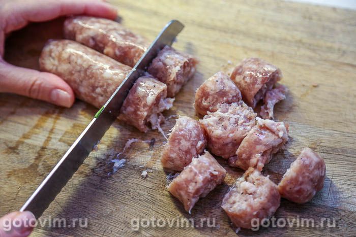 Купаты для жарки (или другие похожие колбаски) нарезать небольшими кусочками.