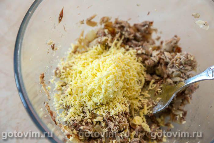 Отложить в сторону половинку желтка, а остальные вареные желтки натереть на мелкой терке в миску с рыбной начинкой. Посолить и поперчить по вкусу.