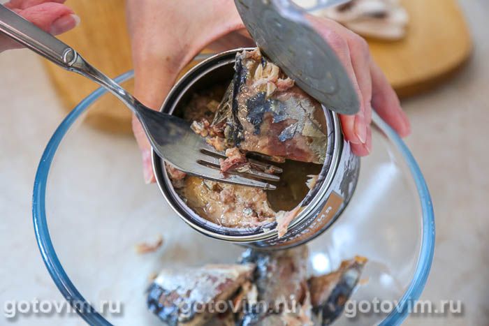 С консервированной рыбы слить жидкость. Кусочки рыбы переложить в миску и размять вилкой.