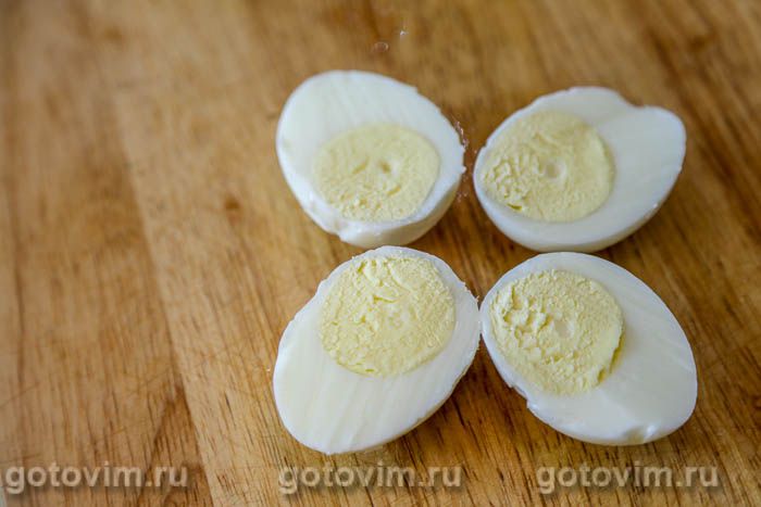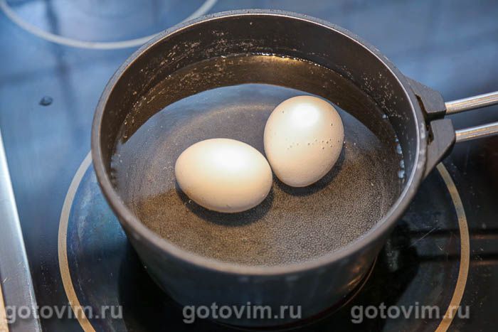 Яйца залить холодной водой, довести до кипения и варить 10 минут. Сваренные вкрутую яйца залить холодной водой, дать им немного остыть и сразу почистить.