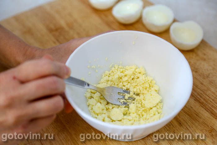 Желтки размять вилкой, чтобы не осталось крупных кусочков. Добавить тертый сыр.