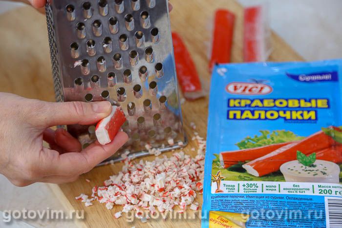 Крабовые палочки VIČI натереть на терке, добавить к остальным ингредиентам начинки.