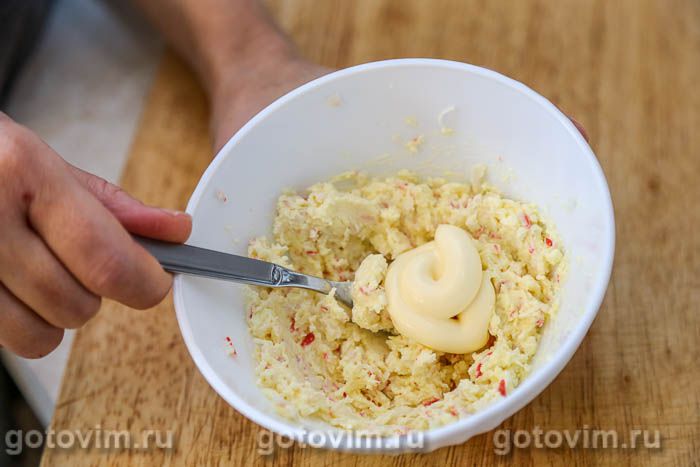 Начинку посолить, положить по вкусу майонез, пропущенный через пресс зубчик чеснока и хорошенько размешать.