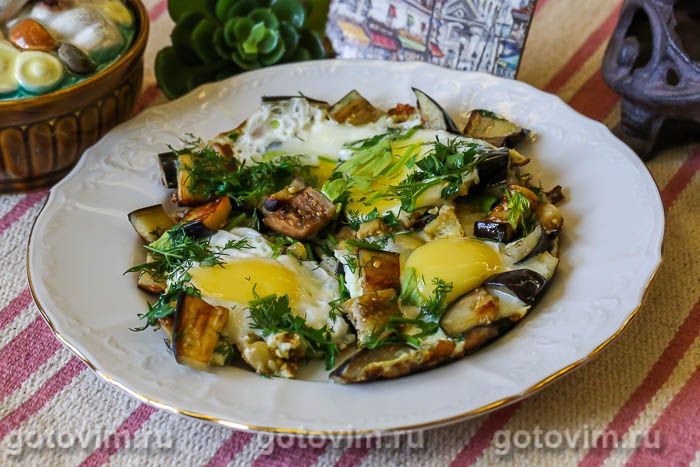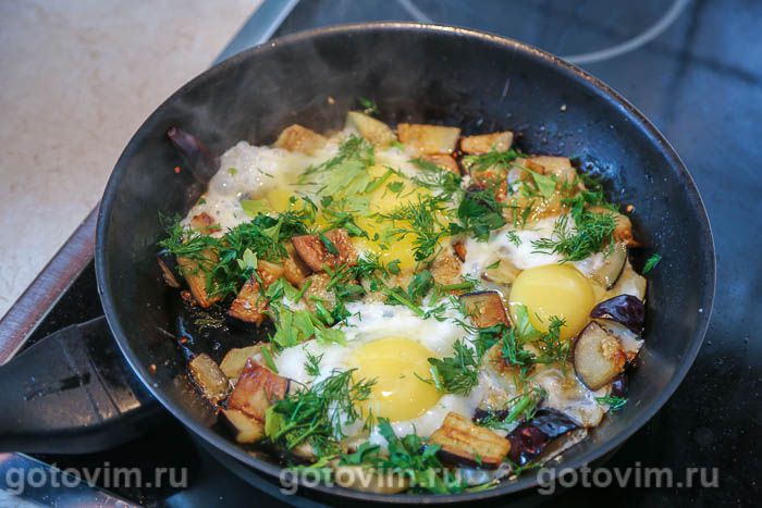 Готовую яичницу глазунью с баклажанами, посолить, поперчить по вкусу, посыпать рубленой зеленью и подавать на стол. Приятного аппетита!