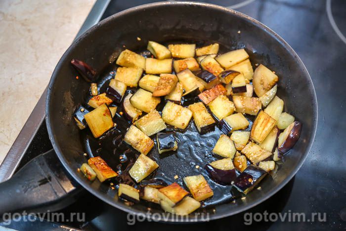 В сковороде разогреть растительное масло, добавить баклажан и обжаривать, помешивая, пока он не подрумянится со всех сторон. Посолить по вкусу.