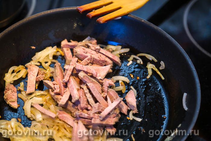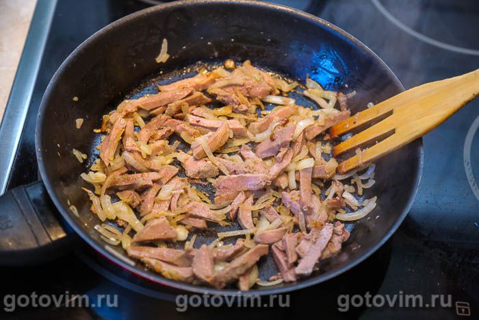 Как только лук станет прозрачным и мягким, добавить в сковороду нарезанные языки.