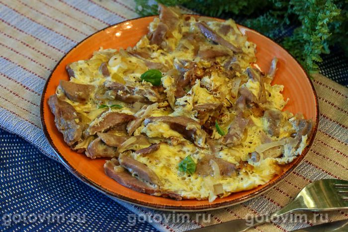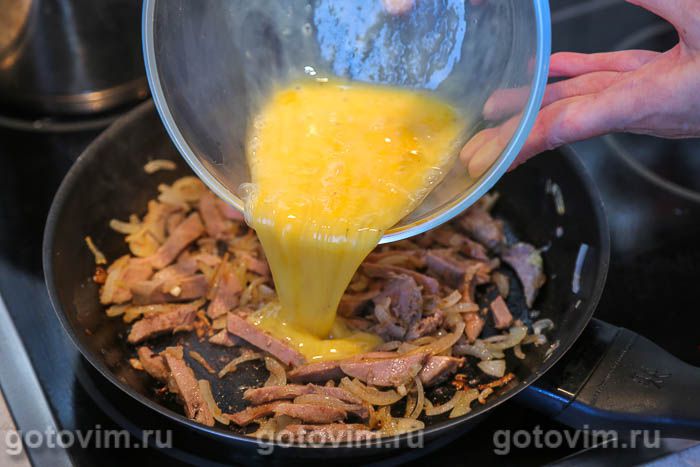 Залить яйцами обжаренный язык с луком. Готовить, помешивая вилкой, пока яйца не схватятся. Переложить яичницу с языком и жареным луком на тарелку и подавать к столу, пока она горячая. Приятного аппетита!