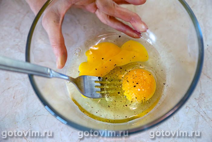 В небольшой миске размешать вилкой яйца с солью и молотым черным перцем.