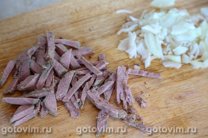 Сваренные языки переложить в холодную воду, дать остыть и, поддевая ножом, снять верхний слой. Очищенный язык нарезать соломкой. Примерно так же порезать лук.