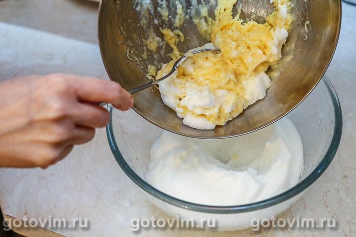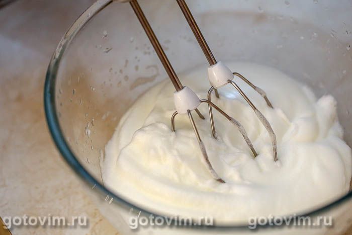 Отделить белки от желтков. Взбить белки с добавлением щепотки соли в густую устойчивую пену.