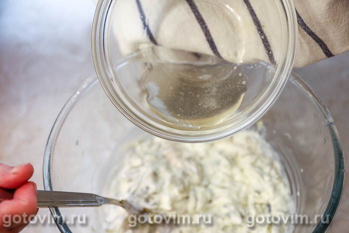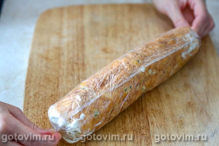 Добавить к сырной массе несколько ложек взбитых белков, размешать, а затем переложить эту смесь во взбитые белки. Делать это надо очень аккуратно, чтобы белки не осели. По желанию добавить пропущенный через пресс чеснок.