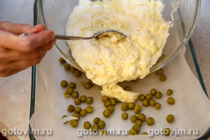 Форму для запекания (или противень) застелить пекарской бумагой. Смазать с помощью кулинарной кисточки растительным маслом и распределить по дну консервированный зеленый горошек. На горошек переложить яично-сырную смесь и разровнять лопаткой. Выпекать в прогретой до 180С духовке около 20 минут.