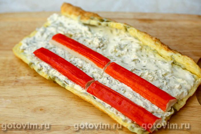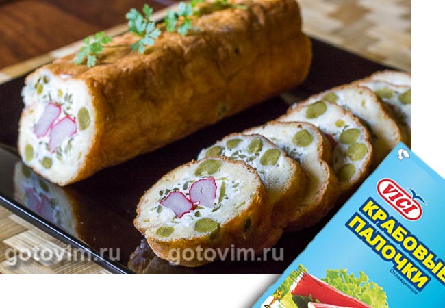 Начинка для яичного рулета может быть любая, но мы выбрать крабовые палочки VIČI. Корж для рулета выпекают в духовке из взбитых яиц с добавлением тертого сыра. Остывший корж смазывают слоем творожного сыра, смешанного с маринованными огурцами и желатином. Поэтому начинка получается плотной, и её можно положить больше, чем если бы это был просто сыр. Получилось вкусно, и выглядит симпатично.