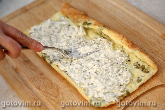 Застелить рабочую поверхность кухонным полотенцем, положить на него яичный корж бумагой вверх. Снять бумагу. Затем аккуратно, помогая себе полотенцем, скрутить рулет (по длинной стороне). Дать рулету остыть, после чего развернуть и смазать охлажденной начинкой из творожного сыра. Края оставляйте свободными, чтобы при скручивании рулета начинка не вылезала наружу.