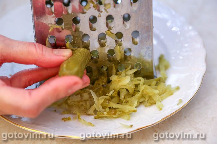 Пока печется яичный корж для рулета, приготовить начинку. Для этого измельчить на терке маринованные огурцы.