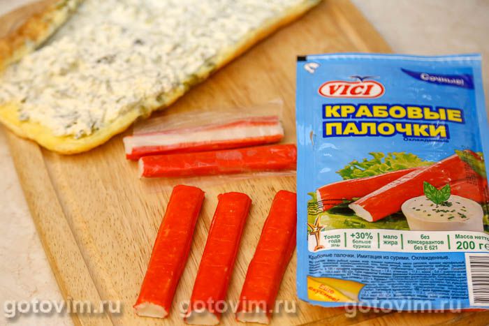 Уложить на начинку крабовые палочки VIČI и скрутить рулет.