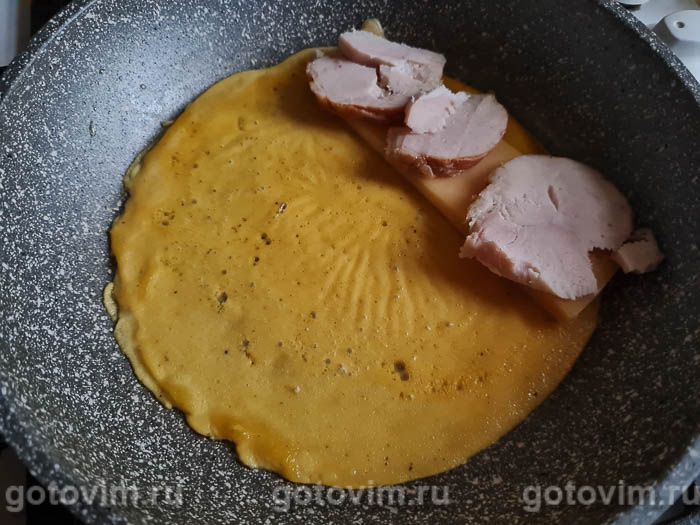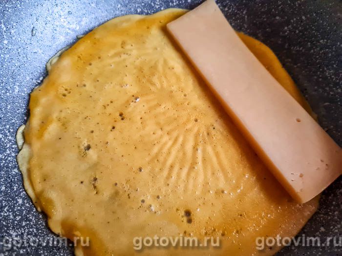 Как только желтковая основа станет плотной, на самый край желточного блина положить ломтик сыра.