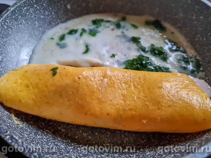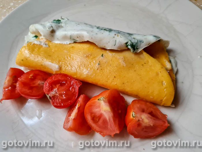 Свернуть желтки с сыром и колбасой рулетом, а на освободившееся место на сковороде вылить белки. Когда белки будут готовы, повернуть рулетик из желтков так, чтобы белковый блин оказался навернут на рулетик с начинкой. Необычный завтрак из яичного рулета с сыром и колбасой готов. Переложить его на тарелку и можно подавать с овощным салатом и с соусом по вкусу. Приятного аппетита!