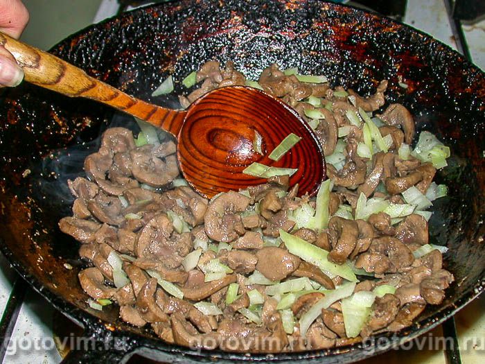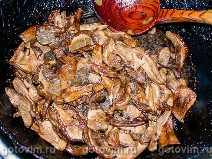 Добавить грибы. Жарить все вместе до полной готовности почек. Посолить и поперчить по вкусу.