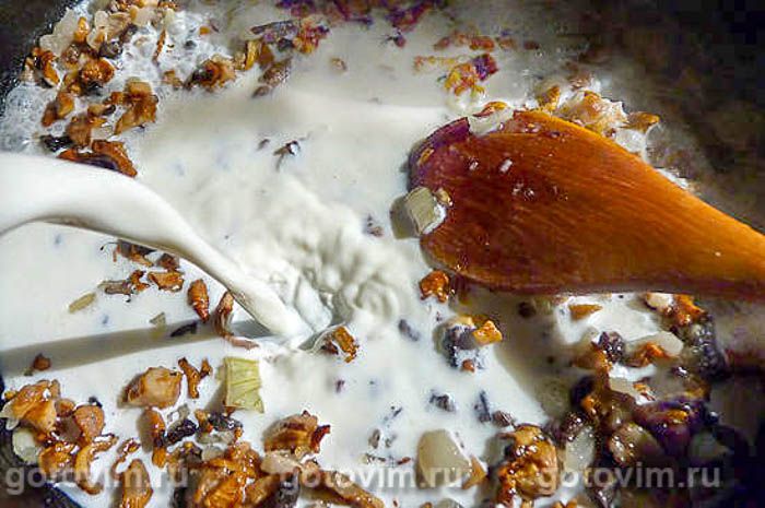 Вливать понемногу 10%-ные сливки, перемешивая. Мука хорошо разведётся. Довести жульен до нужной густоты. Проварить с минуту.