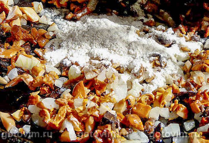 Добавить с ложку муки, перемешать, обжарить с пару минут всё вместе.
