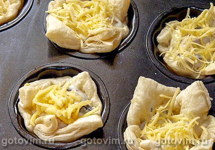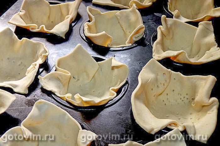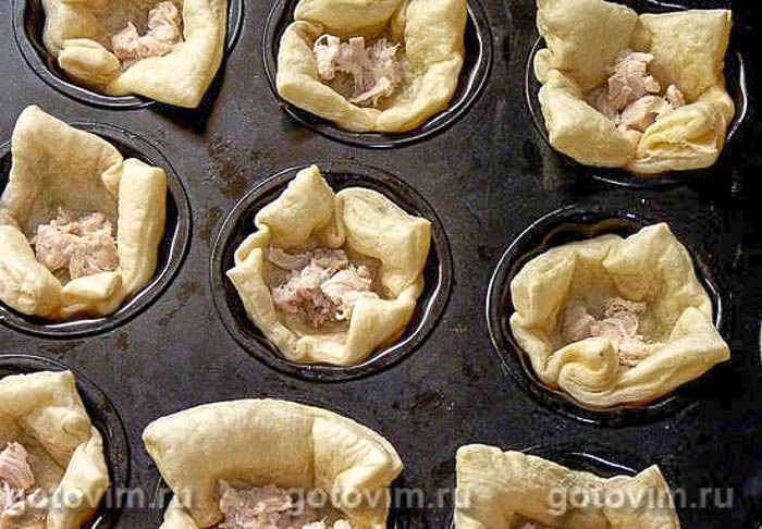 Упаковку слоёного бездрожжевого теста разделить на два прямоугольника. Каждый раскатать, разделить на квадраты по числу формочек для маффинов, у меня 12 мелких. Разложить в смазанные формы, потыкать вилкой, смазать молоком и кинуть в разогретую духовку минут на 10.