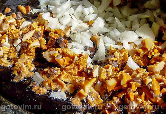 За это время подготовить начинку. Нарубленные мелким кубиком грибы и лук обжарить, не забыв посолить. Можно приправить сухим тимьяном (чабрецом).