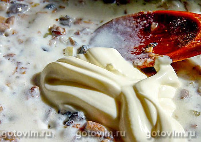 Добавить ложку-другую сметаны, проварить всё пару минут. Основа-жульен готова.