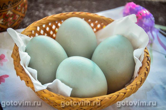 Отправьте куриные яйца в чайный отвар и прокипятите на плите в течение четверти часа. Оставьте яйца в отваре еще на пару часов, после достаньте и обсушите — они приобретут нежный синеватый оттенок. Чтобы скорлупа стала блестящей, слегка их натереть растительным маслом.