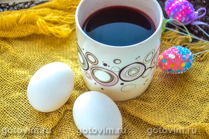 Для окрашивания яиц в отваре каркаде первым делом заварите крепкий чай в кружке. Яйца нужно взять с белой скорлупой. Предварительно вымойте их.