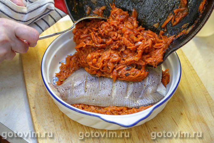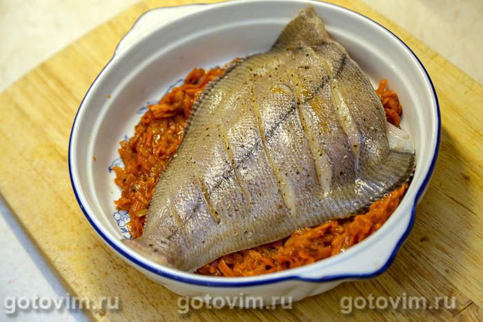 и накрыть второй половиной соуса. Накрыть форму с рыбой в соусе фольгой, поставить в разогретую до 180С духовку примерно на 40 минут, чтобы рыба полностью пропеклась и пропиталась овощным соусом. Готовую камбалу под маринадом можно подавать сразу, еще горячей. Или дать рыбе полностью остыть и есть уже холодной, как закуску. Тоже вкусно. Приятного аппетита!