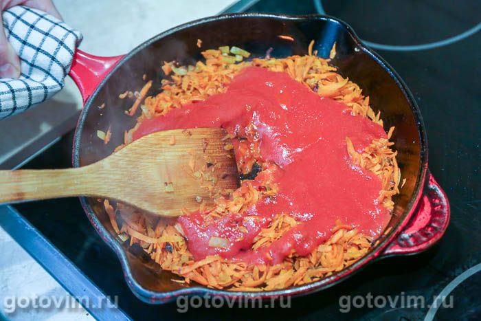 Через 10 минут добавить томатную пассату. Вместо неё можно положить в сковороду с овощами томатную пасту и разбавить примерно 300 мл питьевой воды. Для аромата положить в сковороду с овощами в томате лавровый лист, перец и гвоздику. Тушить, помешивая, еще примерно 15 минут, пока морковка не станет мягкой. Влить уксус и размешать.