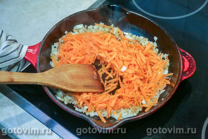 В глубокой сковороде разогреть растительное масло. Пассеровать лук до прозрачности, следом положить в сковороду морковь. Накрыть сковороду крышкой и тушить морковь с луком в масле примерно 10 минут, время от времени помешивая лопаткой.