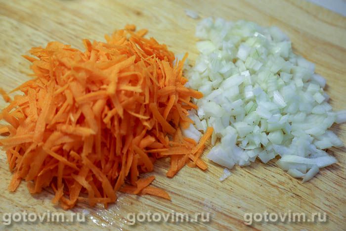 Морковь вымыть, очистить, натереть на крупной терке или нарезать соломкой. Луковицы очистить, мелко нарезать.