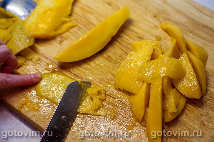 Спелое сочное манго разрезать пополам, вырезать косточку, мякоть очистить от кожуры. Сделать это можно по-разному, здесь показываю один из вариантов, как очистить манго.
