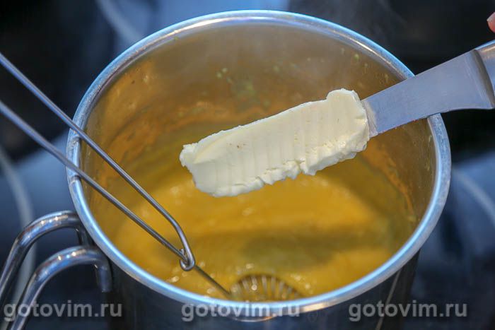 После этого снять ковш с готовым курдом из манго с огня и добавить сливочное масло. Перемешать венчиком, разложить по баночкам и дать остыть при комнатной температуре. Если готовите манговый крем впрок, то храните в холодильнике примерно 1 неделю.