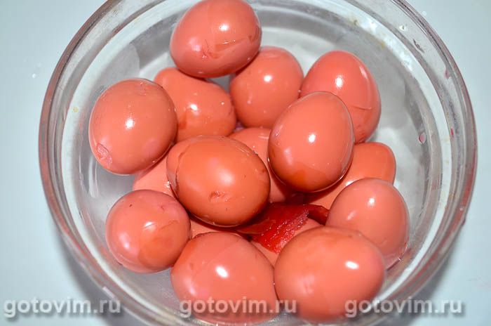 Очищенные перепелиные яйца сложить в горячий маринад. Спустя три — четыре часа яйца приобретут красивый цвет. Если они нужны для салата, то их уже можно использовать.
