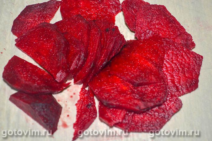 Свёклу вымыть. Нарезать на тонкие пластины.