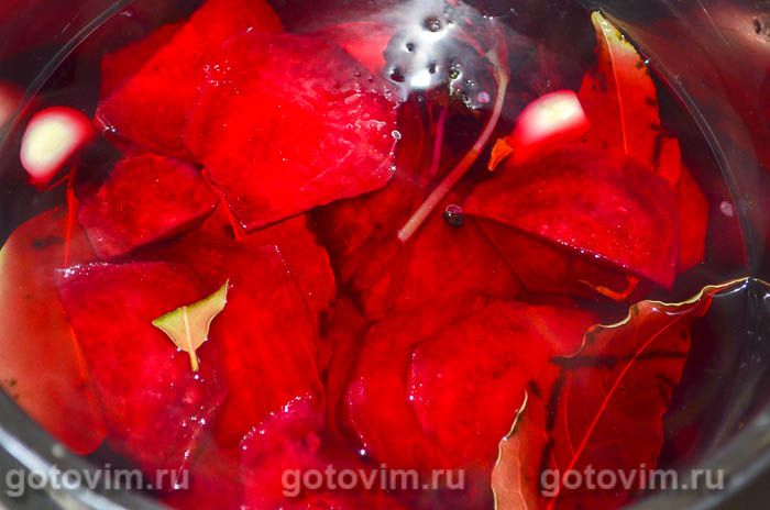 Залить свёклу водой. Положить в кастрюлю со свёклой лавровый лист. Туда же отправить перец горошком, гвоздику, чеснок. Острый перец положить по вкусу. Всыпать сахар. Добавить соли. Нагреть маринад до кипения, варить 5-6 минут. В конце приготовления в маринад добавить уксус и сою.