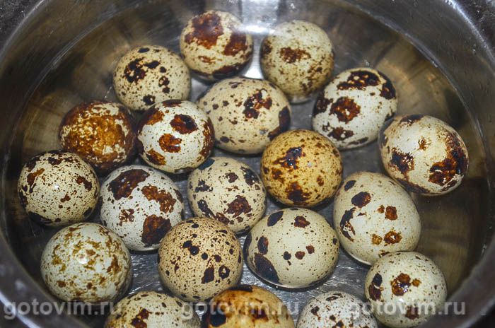 Перепелиные яйца сложить в кастрюлю. Залить водой. Нагреть все до кипения и варить 8-9 минут.